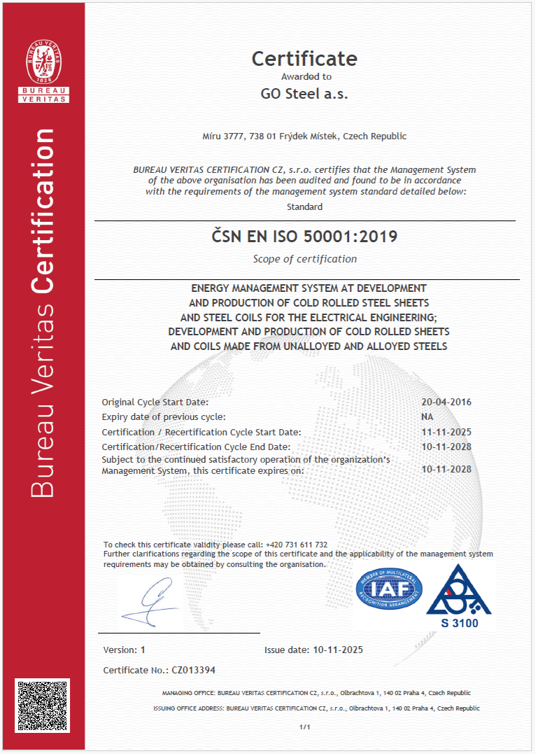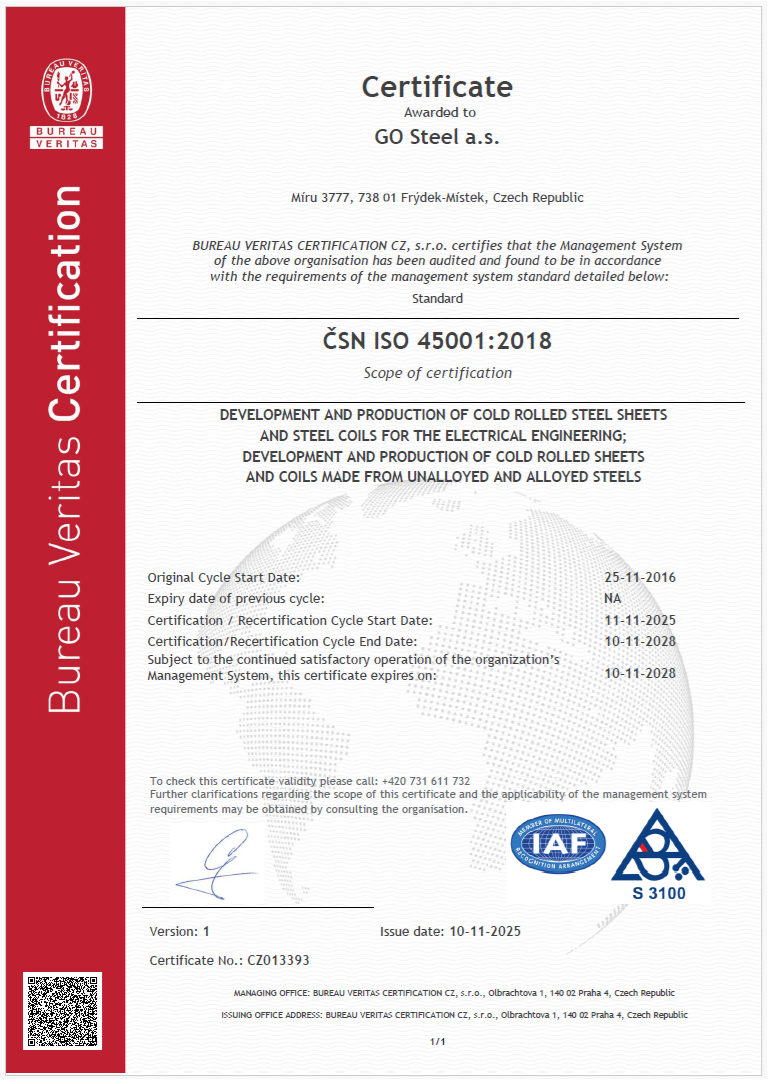 GO Steel a.s. has implemented the Integrated Management System (IMS) of system components of Quality Management System (QMS), Environmental Management System (EMS), Health and Safety Management System (OHSMS) and Energy Management System (EnMS). Implementing and up-holding the Management System for quality, environmental protection, occupational health and safety and energy management is a strategic decision of the Company management.