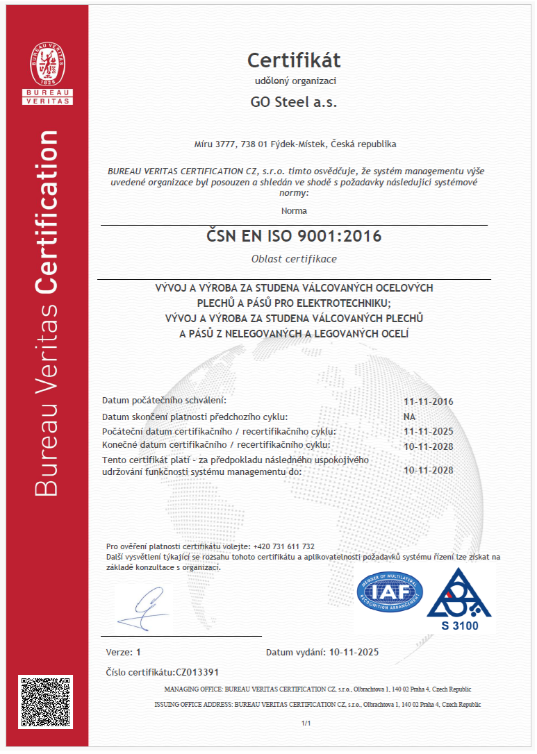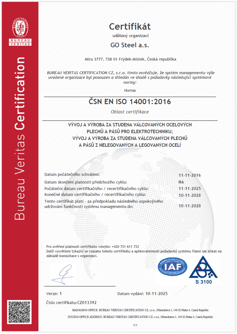 Společnost GO Steel a.s. má zavedený integrovaný systém řízení (IMS) systémových složek managementu kvality (QMS), ochrany životního prostředí (EMS), bezpečnosti a ochrany zdraví při práci (OHSMS) a hospodaření s energií (EnMS). Zavedení a udržování systému managementu kvality, ochrany životního prostředí, bezpečnosti a ochrany zdraví při práci a hospodaření s energií je strategickým rozhodnutím managementu společnosti.